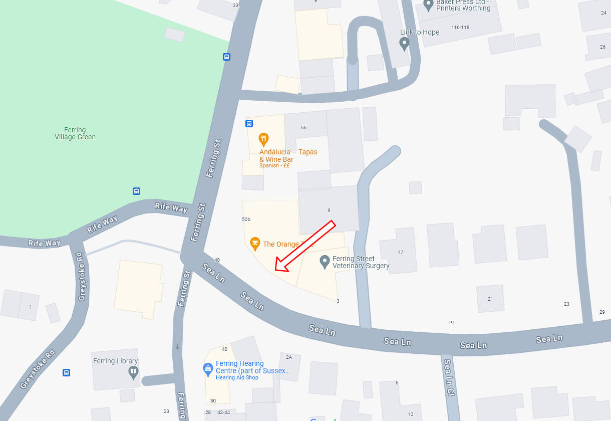 We are based in the heart of Ferring village above The Orange Tree Cafe on the junction of Sea Lane and Ferring Street.